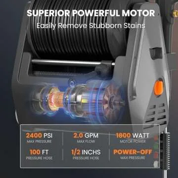 Show more Meet the Giraffe Tools Grandfalls Pressure Washer G30B, the ultimate cleaning solution for your toughest outdoor tasks! Equipped with a powerful 1800 Watt motor, this efficient electric pressure washer can generate an impressive 2400 PSI of water pressure and up to 2.0 GPM of water flow, making it effortless to blast away tar, grease, oil stains, rust, and stubborn grime. Its advanced design and robust features promise quick and effective cleaning, turning what used to be a chore into a breeze!
