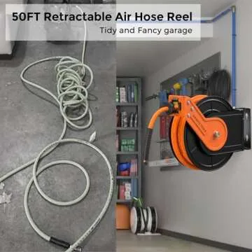 Show moreThe Giraffe Tools TA15BPLUS Retractable Air Hose Reel is your ultimate solution to a clutter-free workspace. Designed for the modern garage, workshop, or barn, this premium air hose reel boasts a robust construction and unparalleled functionality. Featuring a 50 ft hybrid hose that withstands temperatures from -40 to 150 ℉, it ensures seamless operation throughout the year. Its auto rewind mechanism lets you with just a gentle tug; the air hose retracts effortlessly, keeping your space neat and free from tangled hoses. The heavy-duty quality includes brass fittings and a corrosion-resistant powder coat that promises durability and longevity.<\/p>