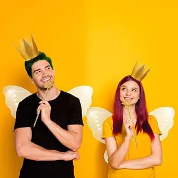 The wings are made of durable nylon and organza, while the crowns are crafted from quality paper with an adjustable design.