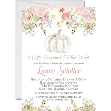 Show moreIntroducing our charming **Girls Fall Pumpkin Baby Shower Invitations**, designed especially for the little pumpkin arriving soon! Each invitation features a delightful blend of pink watercolor pumpkins adorned with delicate flowers, artistically personalized with your special event details. Crafted from high-quality 110lb matte cardstock, these invitations measure a perfect 5x7 inches, ensuring a beautiful presentation that will excite your guests before the celebration even begins. The included white envelopes add a touch of elegance, making it effortless to send these lovely creations out into the world.
