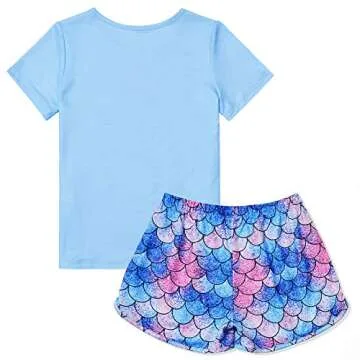 Girls Mermaid Pajama Sets - Cute Cotton Blue Sleepwear Shirt & Shorts