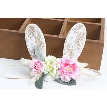 Girls Spring Bunny Ears Headband Birthday Flower Crown Woodland Floral Head Piece for Toddler (Lace Ears)