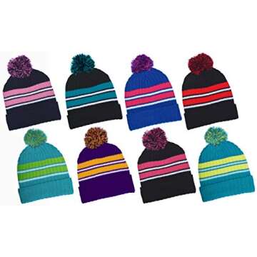 Show moreIntroducing the perfect accessory for your little adventurer this winter - our Girls Striped Knit Tomboy Beanie. Designed specifically for active girls who love to make a statement, this medium-weight stretch knit hat features a full wrap-around knit cuff for an exceptional fit and support. The playful sporty stripes in a vibrant combination of teal and yellow, alongside the cute matching Pom Pom at the top, add just the right touch of adorable charm to any winter outfit. Made from high-quality 100% acrylic fabric, this beanie assures maximum warmth and comfort for all those cold-weather adventures, whether it’s playing outside, running errands, or hitting the slopes for some skiing or snowboarding fun.