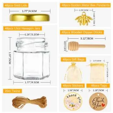 Show more Introducing our delightful Mini Glass Honey Jars Gift Set, an exquisite collection designed to bring a touch of sweetness to any occasion. This charming set includes 48 mini glass honey jars, each capable of holding 1.5oz of your favorite treats. With elegant gold lids, these jars are perfect for storing honey, jam, candies, and even cosmetics, making them a versatile addition to any home. The jars come complete with wooden dippers, stunning golden bee charms, golden gift bags, tags, stickers, and 30 meters of twine for personalized packaging.