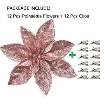 GL-Turelfies 12 Pcs Glitter Christmas Flowers(16cm/6.3’’) with 12 Pcs Clips Artificial Poinsettia Flower Christmas Tree Flower Decorations Xmas Tree Ornaments (Rose Gold)