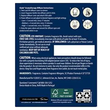 Show more Indulge in a delightful ambiente with the Glade Aromatherapy Diffuser & Essential Oil, where the exquisite fusion of Italian Bergamot and Guatemalan Lemongrass transforms your space into a serene retreat. This innovative aroma diffuser not only enhances your environment with its soothing scents but also exudes elegance, seamlessly fitting into any décor. The easy-to-use controls allow you the freedom to choose from three fragrance intensities - low, medium, or high, granting you a personalized aromatic experience to match your mood.