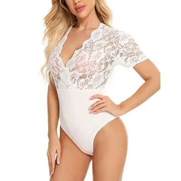 Gladiolus Women Lace Bodysuit Sexy Deep V Snap Crotch Clubwear Short Sleeve Tops S-XXXL