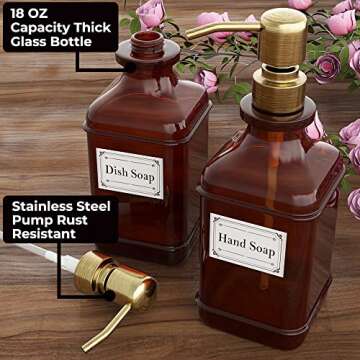 GLADPURE Soap Dispenser 2 Pack, Hand Soap Dispensers with 18 Oz Antique Design Thick Amber Glass Bottle, 316 Rust Proof Stainless Steel Pump, 6Pcs Stickers, for Lotion, Soap - Brushed Gold