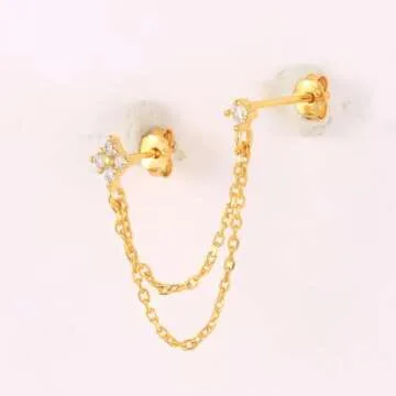 GLAHORSE 925 Sterling Silver Four Zircons Flower Stud Earrings For Women Double Studs Chain Tassel Piercing Earring 18K Gold