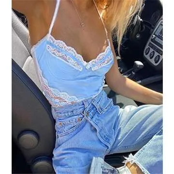Glamaker Women’s Lace Patchwork Y2K Crop Top Sexy V Neck Spaghetti Strap Camisole Printed Slim E-Girl Tank Tops (Small, B-Blue)