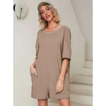 Glamaker Women's Oversized Summer Romper Casual Athletic Tee Romper Pajama Backless Loose Fit Shorts Jumpsuit Overalls With Pockets (Light Brown M)