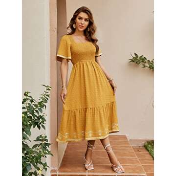 Glamaker Women's Short Sleeve Smocked Square Neck A Line Summer Flowy Midi Dress