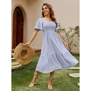 Glamaker Women's Short Sleeve Smocked Square Neck A Line Summer Flowy Midi Dress Light Blue Small
