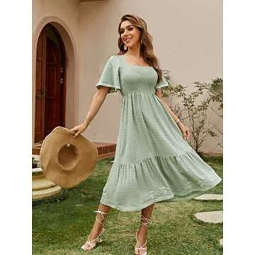 Glamaker Women's Summer Casual Short Sleeve Smocked Square Neck A Line Flowy Midi Dress Midi Dress