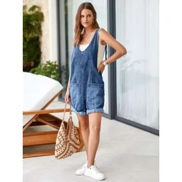 Show more Step into effortless summer style with the Glamaker Women's Casual Sleeveless V Neck Denim Romper Overall Shorts. Crafted from a premium blend of 90% Cotton and 10% Polyester, this romper is not only soft and lightweight but also provides all-day comfort. The design features a chic v-neck and a loose fit that flatters all body types, making it an ideal outfit for warm spring and summer days. Its versatility shines as it can be easily dressed up or down, ensuring you stay fashionable from casual outings to beach adventures.
