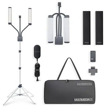 The GLAMCOR Multimedia X stands out with its remote-controlled adjustable color temperature and brightness, portability, and included accessories like the tripod and carrying case. Unlike competitors, it offers a smartphone mount with a USB power port, making it a versatile choice for professionals and creators alike.