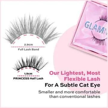 Show more Discover the exquisite Princess Faux Mink Half Eyelashes, a standout offering from Glamnetic, expertly designed for those seeking an effortless beauty boost. These natural cat eye half eyelashes are not just an accessory; they are a daily essential for anyone wanting to enhance their look with minimal effort. Constructed from the finest synthetic fibers, these vegan and cruelty-free lashes mimic the softness and appearance of real mink. The 6mm - 12mm length makes them ideal for beginners to achieve a subtle yet striking appearance that fits seamlessly into any daily routine.