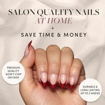 Show more Introducing the ultimate beauty enhancement for nail lovers everywhere! This Glamnetic Press-On Nail Set is designed to deliver high-quality, salon-style nails right at your fingertips. The Red French Tip Glitter Almond Nails are not just a feast for the eyes; they provide a fun and flashy flair to all your holiday looks and beyond. Each nail features a clever tapered design towards the cuticle, ensuring a seamless and natural appearance that will enhance your overall aesthetic.