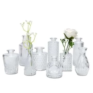 Show more Introducing our exquisite collection of charming mini vases, crafted from high-quality soda lime glass. Each piece is a testament to fine craftsmanship, designed to elevate any floral arrangement with its exceptional light transmission rate. The vintage-inspired design and variety of sizes and shapes make these vases perfect for any season or occasion. With intricate embossed patterns and smooth lines, these vases allow you to artistically combine flowers in endless ways, whether you prefer vibrant blooms, delicate velvet flowers, or rustic dried options.