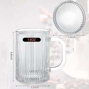 Glass Coffee Mugs Clear Mug - 13 Oz Ribbed Mugs Classical Vertical Stripes Glass Tea Cups With Lids Set of 4 - Elegant Lovely Present for Anniversary Weddings Christmas Birthday