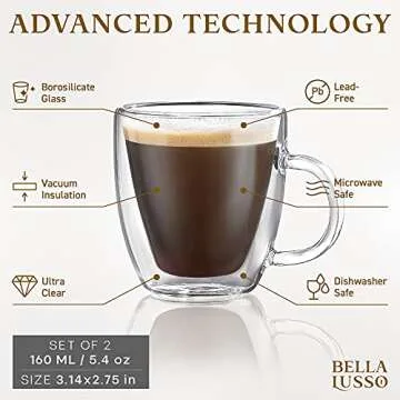 Show more Introducing the modern Bella Lusso Espresso Cups, meticulously crafted for the espresso enthusiast in your life. These beautifully designed cups not only add a splash of elegance to any kitchen but also ensure a comfortable drinking experience. The innovative design prevents side heat transfer, making it impossible to burn your fingers while sipping your favorite espresso. No more discomfort, just pure joy in every sip.