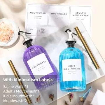 Show more Introducing the perfect solution for all your mouthwash dispensing needs – a beautiful and practical set of two glass mouthwash dispensers, accompanied by reusable and paper cups for versatile use. This thoughtfully curated package features two premium thickened glass dispensers (16.9oz) and two elegant 1oz reusable glass cups, as well as 21 more paper cups (3oz) for gatherings or sleepovers. The set comes complete with a convenient cup holder, a stainless steel funnel for easy refilling, five minimalism labels to keep your bottles stylish and organized, and two blank wooden tags for customization.