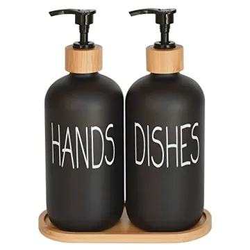 Show moreExperience the perfect blend of style and functionality with the DIDROOM Soap Dispenser Set. This beautifully crafted set includes two black glass bottles with bamboo pumps and a matching bamboo tray, designed to enhance the aesthetics of any modern bathroom or kitchen. The matte black finish of the dispensers provides an elegant touch while ensuring a clutter-free environment. Unlike ordinary pump bottles, the DIDROOM set features permanent, waterproof labels that eliminate the frustration of identifying hand soap versus dish soap. These easy-to-read labels remain intact even after daily use, making it simple for everyone to find exactly what they need. The durable glass construction of the bottles paired with high-quality bamboo pumps ensures longevity, resisting rusting and breaking like many low-quality options on the market.