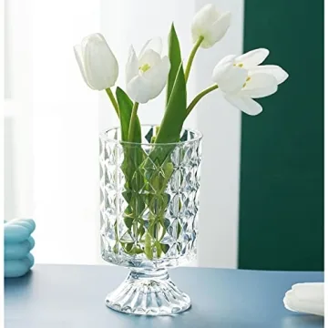 Show more This stunning goblet-shaped vase is not just a vessel; it's a statement piece! Standing at 7 inches tall and measuring 4.1 inches wide, this vase perfectly combines beauty and functionality. Crafted from high-quality, lead-free glass, it features a thickened bottom for stability and durability. The vase is handcrafted using high-temperature techniques, ensuring that it is both safer and more environmentally friendly than traditional glass options.