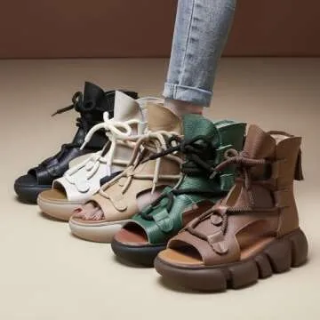 GLBDU Women's Genuine Leather Peep Toe High Top Platform Sandals Vintage Casual Hollow Lace Up Back Zipper Chunky Wedge Ankle Boots Comfortable Breathable Roman Sandals (Beige,4.5)