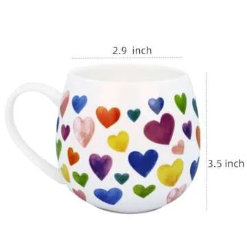 Show moreIntroducing a delightful gift that expresses warmth and affection—this unique, cute coffee mug is the epitome of charm for any coffee or tea lover in your life. Crafted by a reputable brand using the finest quality bone china, it showcases a creamy white surface adorned with a vibrant, colorful heart-shaped pattern. With a generous capacity of 11oz, it’s perfectly sized to hold your favorite brew, whether it’s a steaming cup of coffee, latte, tea, or hot chocolate.