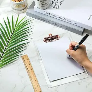 Show more Introducing the Glenmal 3 Pieces Acrylic Gold Clipboard Set – the perfect blend of elegance and practicality for all your document-handling needs. Crafted with a stunning acrylic design adorned with a chic gold metal clip, this set includes three assorted clipboards that add a touch of sophistication to your workspace at home, in the classroom, or at the office. Each clipboard boasts a dimensions of 9 1/2 inches by 13 inches, providing ample space for letter-sized documents while maintaining a low profile that makes it easy to transport and store.