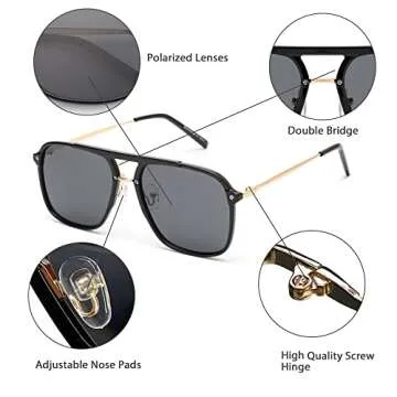 GLINDAR Retro Square Aviator Sunglasses for Men Women, Polarized Lens UV Protection Black/Grey