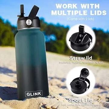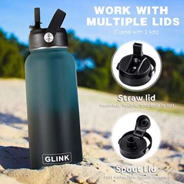 GLINK Stainless Steel Water Bottle with Straw, 32 oz Wide Mouth Double Wall Vacuum Insulated Water Bottle Leakproof, Straw Lid and Spout Lid with New Rotating Rubber Handle