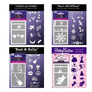 Unleash creativity and fun with the best of GlitZGlam glitter tattoo stencils, designed to inspire imagination in children, teenagers, and adults alike. This vibrant assortment includes enchanting designs from various themes, such as the whimsical 'Things with Wings' featuring intricately detailed shapes like cascading butterflies and graceful fairies. With an impressive collection that combines fairy tales and rock aesthetics, the 'Fairytales' and 'Rock-N-Rollin'' sets ensure every user finds designs to...