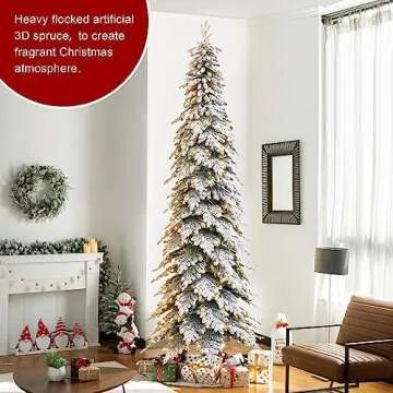 Glitzhome 11ft Pre-Lit Flocked Pencil Spruce Artificial Christmas Tree with 700 Warm White Lights and Sturdy Metal Stand for Home, Office, Party Decoration