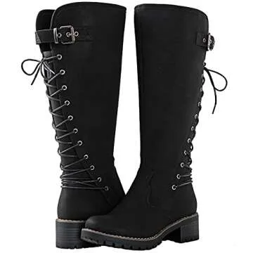 Stylish GLOBALWIN Women's Chunky Heel Black Lace Up Back Knee High Fashion Boots