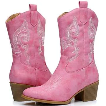 GLOBALWIN Women's Pink Mid Calf Cowgirl Boots Classic Embroidered Western Cowboy Boots for Women Chunky Low Heel Size 8M