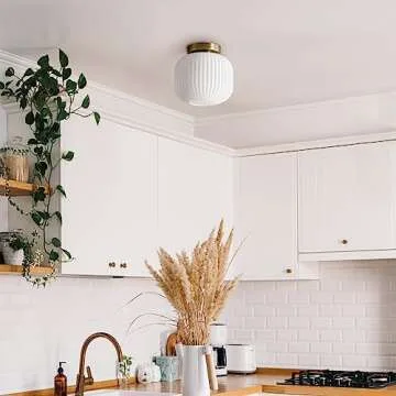 Show more Introducing the **Globe Electric 66000079 1-Light Flush Mount Ceiling Light Fixture**, your perfect lighting solution that unites functionality and style. With a captivating shape and luxurious matte brass finish, this ceiling light is not just a source of illumination, but a stunning decor element that enhances any room. The unique frosted ribbed glass shade envelops your space in a soothing glow, making your home feel cozy and glamorous. This versatile fixture is designed to complement various interior styles, from modern minimalism to classic elegance, ensuring it fits seamlessly into your décor.