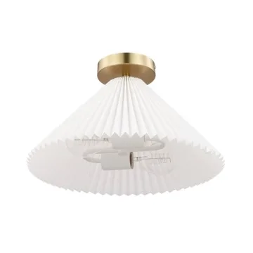 Show more Introducing the Globe Electric Novogratz x 66000085 2-Light Matte Brass Flush Mount Ceiling Light—a stunning blend of modern elegance and cozy aesthetics. This exquisite lighting fixture is designed with the discerning homeowner in mind, encapsulating the essence of grandmillennial style that seamlessly marries contemporary charm with nostalgic warmth. The unique combination of matte brass and an elegant off-white pleated fabric shade makes this ceiling light not just a source of illumination, but a beautiful decorative piece that enhances your space.