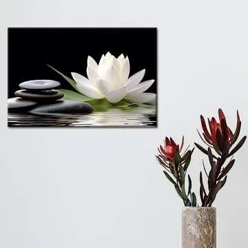 GLOKAKA Zen Canvas Wall Art,White Lotus Bloom in Water with Spa Stone,Black and White Bathroom Canvas Wall Art,Zen Spiritual Decor for Yoga Meditation Room Living Room