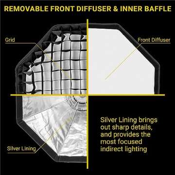 For those looking for versatility, this softbox goes above and beyond. The reversible opaque deflector cover allows photographers to manipulate contrast and sharpness effortlessly, providing three distinct levels of lighting to suit various shooting styles. Whether you’re capturing a soft, diffused glow or more defined contrast, this softbox adapts to your creative vision. The Eggcrate Grid included in the design ensures precise light control, accentuating facial features and offering a professional touch to every shot.