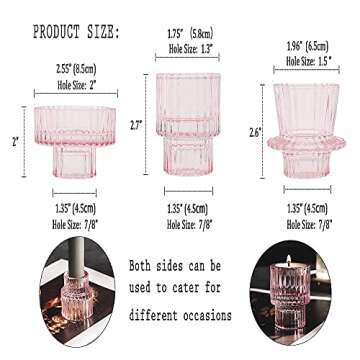 Show more Elevate your home decor with the exquisite GlrYer Candlestick Holders Set of 3, thoughtfully crafted to enhance any occasion. These high-quality candlestick holders are made entirely from clear glass, allowing their smooth surfaces to reflect a stunning pink glow that effortlessly transforms your space into a sanctuary of style. Each holder is designed with an eco-friendly, unleaded composition, ensuring a safe and odorless experience that you can trust in both your living space and during memorable events.
