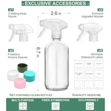 GMISUN Glass Spray Bottles for Cleaning, Spray Bottles for Cleaning Solutions 16oz, Reusable Spray Bottle for Plants, 4Pack Clear Cleaning Spray Bottle - 4 No Leak Nozzles, Silicone Sleeve, Labels