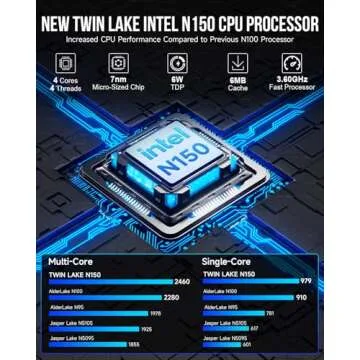 Show more Introducing the GMKtec Mini PC N150 G3 Plus: A powerful, compact desktop computer designed for the modern digital lifestyle. Featuring the latest Intel Twin Lake N150 processor which boasts a remarkable 4 cores and 4 threads, this mini pc can reach burst speeds of up to 3.6GHz. Experience a 6%-10% performance enhancement over its predecessor Alder Lake N100 and a significant 15% improvement over the N95. This means you can handle routine tasks, office work, and home entertainment seamlessly, all while enjoying the space-saving design that makes it more convenient than traditional desktops.