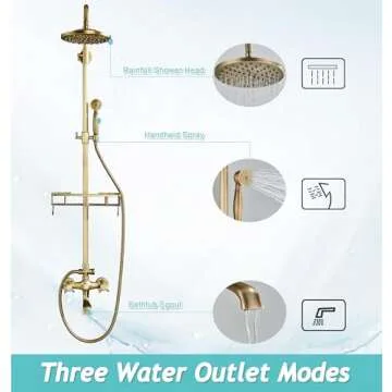 Gmusre Antique Brass Shower Fixture Bathroom Shower Faucet Set 8 Inch Rainfall Shower Head Handled Shower Waterfall Tub Spout Wall Mounted Outdoor Shower System with Shower Shelf