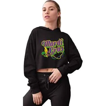 Go All Out Medium Black Womens Mardi Gras Cropped Hooded Sweatshirt