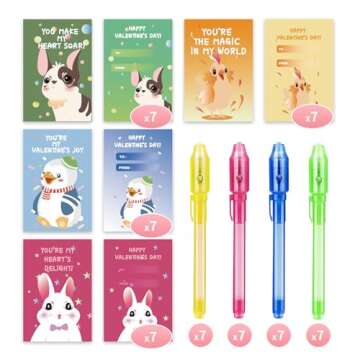 Show more Introducing the Super Value Pack of Valentine's Day greetings that brings joy and excitement to the classroom! This delightful set features 28 charming Valentine's cards paired with 28 invisible ink pens, making it the perfect blend of creativity and fun. Each card boasts unique designs that will captivate young hearts, ensuring that every child has a memorable Valentine’s experience.