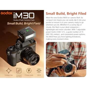 Show moreIntroducing the GODOX iM30 Mini Flash Camera Flash - your new essential companion for capturing brilliant images on the go! This compact and lightweight flash weighs merely 78 grams, making it an effortless addition to any photographer's gear bag. Designed with portability in mind, it excels with pancake and compact lenses, ensuring that you never miss a photo opportunity whether you're on vacation, a casual outing, or during everyday shoots. Please keep in mind that when paired with larger lenses, shadows may be cast, so we recommend using it with smaller lenses for the best performance.