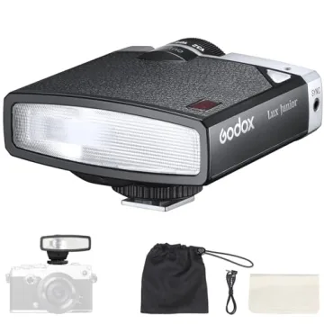 Show more Introducing the Godox Lux Junior Retro Camera Flash, a perfect fusion of vintage charm and modern sophistication that every photography buff will love. Its compact design measuring 2.9 x 2.8 x 2 inches and weighing only 130g makes this flash a breeze to carry, empowering you to unleash your creativity anywhere and anytime. Crafted from durable plastic, the Lux Junior is not only robust but also incredibly stylish, making it the ideal accessory for photographers who appreciate both function and design.