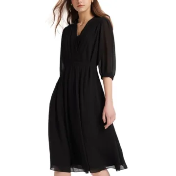 GOELIA Women's Summer Dress 3/4 Sleeve Casual Boho V-Neck Pleated Lace Up Wrap Flowy Midi Dress Wedding Guest Dresses Black